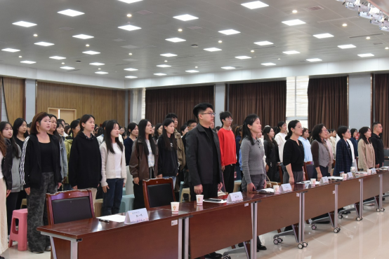 大会在庄严的国歌声中拉开序幕,全体师生肃立高唱国歌。