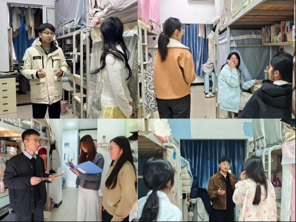 检查过程中,张航与辅导员老师们深入每间宿舍,认真查看卫生状况与物品摆放秩序,重点排查了违规使用大功率电器、私拉乱接电线、存放易燃易爆物品、堵塞消防通道等安全隐患,并细致了解了宿舍通风、消毒等日常卫生维护情况。