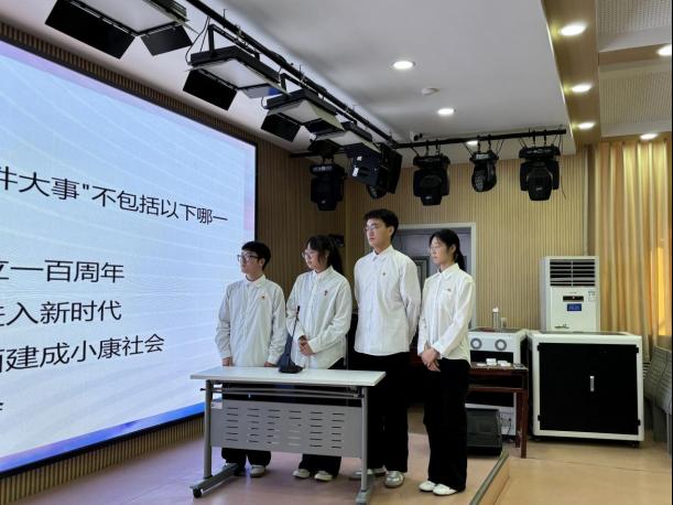 本次竞赛分为答题赛和积分赛两个环节。答题赛环节,五支参赛队伍凭借扎实的知识储备与沉稳的临场表现,全神贯注、应答如流,充分展现了他们对党的最新理论成果的学习成效。积分赛环节,选手们围绕党的二十届四中全会的核心要点、重大决策部署等内容展开激烈竞逐,各队比分交替上升,现场氛围紧张热烈,体现出良好的理论功底与进取精神,观赛同学亦深受感染,掌声阵阵。