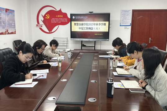 【通讯员:张航】10月27日下午,智慧金融学院在明德楼214会议室召开2025年秋季学期第六次中层干部例会。会议由综合办公室主任郭会芳主持,院长吕永霞、党支部书记赵碧漪、副院长赵歌及全体中层干部参加。