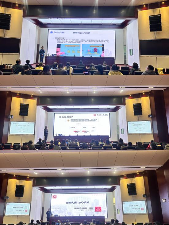 在讲座环节,三位专家结合丰富的临床经验与典型案例,分别围绕不同主题展开详细讲解。河南省人民医院乳腺外科副主任梁栋,聚焦“乳腺健康管理”,深入浅出地剖析了乳腺结节、乳腺癌的成因与高发人群,重点分享了日常预防方法、定期筛查的重要性及筛查项目选择。呼吸科副主任医师杨会珍以“肺结节健康管理” 为主题,针对近年来体检中肺结节检出率较高的情况,用通俗易懂的语言解释了肺结节的形成原因、良恶性判断标准,破除了 “发现肺结节就是癌症”的认知误区。她还结合临床案例,详细介绍了不同类型肺结节的随访观察周期与治疗建议,提醒大家避免过度焦虑,科学应对肺结节问题。内分泌副主任医师尚敬则围绕 “血脂异常的管理” 展开分享,从血脂的组成、血脂异常的危害入手,结合教职工久坐、压力大等工作特点,分析了血脂异常的诱发因素,并给出了针对性的解决方案,不仅推荐了适合教职工的饮食搭配与运动方式,还强调了规律作息、情绪调节对血脂管理的重要作用,让大家意识到健康管理需从生活细节入手。