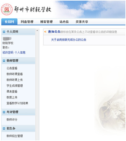 3、此次信息录入依据2014年02月16日郑州财税金融职业学院全体教职工名单,如果新进老师无法查到或无法登陆内网办公系统的,可联系现代教育与实训中心。