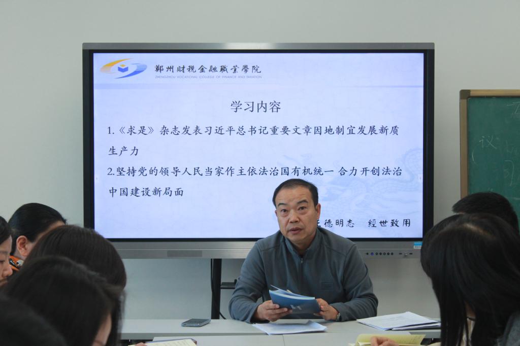 主任赵培勇带领全体教师重点学习了习近平总书记重要文章与论述的核心要义,围绕“依法治国”与“新质生产力”两大主题,系统阐释了其时代背景、理论内涵与实践路径。他要求全体教师要深刻领会坚持党的领导、人民当家作主、依法治国三者有机统一的根本要求,牢固树立法治思维,增强依法执教意识;同时,要准确把握新质生产力的科学内涵与发展方向,结合职业教育特点,推动教学理念与内容创新,服务高质量发展大局。