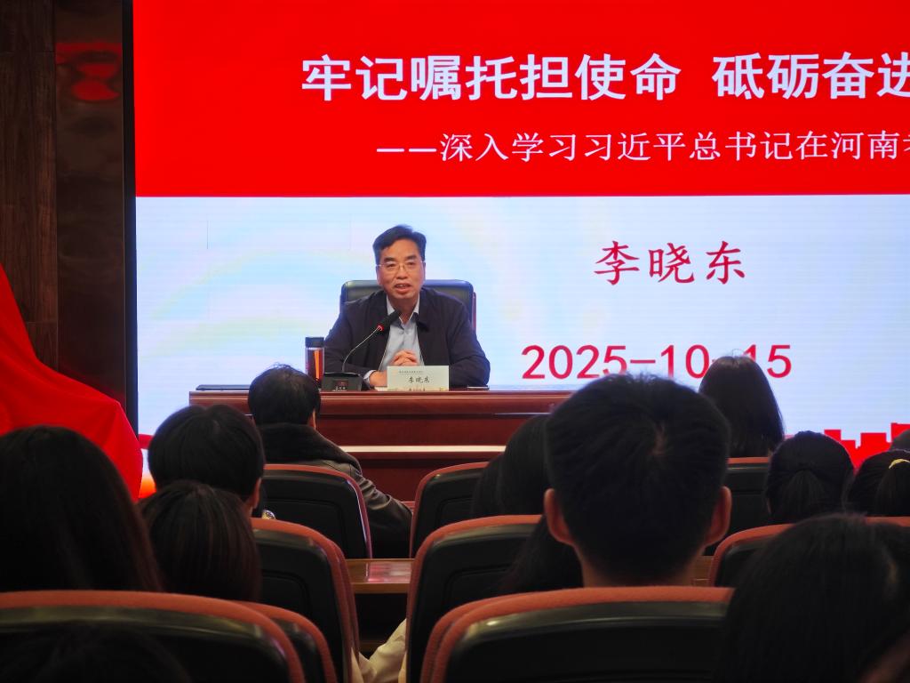 【通讯员:刘凤娟】10月15日,校长李晓东以《牢记嘱托担使命 砥砺奋进新征程——深入学习习近平总书记在河南考察时的重要讲话精神》为题,为数字商贸学院师生讲授了一堂思想深刻、内容生动、紧密联系学生实际的思政课。