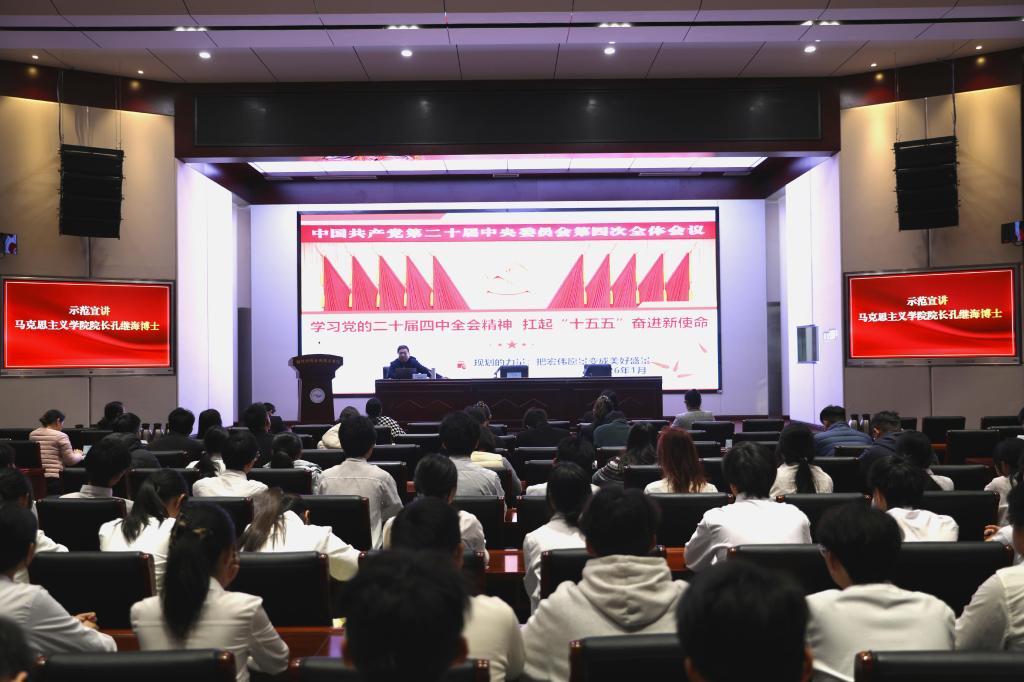 成立仪式后,马克思主义学院院长孔继海博士以《学习党的二十届四中全会精神 扛起“十五五”奋进新使命》为题,作首场示范宣讲。紧扣全会主题,系统阐释了我国制度优势、治理现代化目标任务与战略部署,内容深入浅出、逻辑清晰,为师生深刻领会全会精神提供了有效指导,也为宣讲团后续工作树立了鲜活样板。