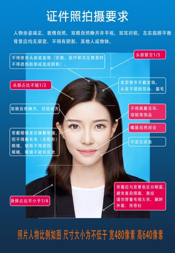(三)学生在图像采集时务必真实表达本人相貌,禁止美颜修图,务必素颜照,尽量使用手机自带相机拍摄,禁止对图像整体或局部进行镜像、旋转等变换操作,不得对人像特征进行修饰处理,不得添加边框、文字、装饰图案等其他内容。图像信息须正面免冠照,禁穿蓝色衣服(背景为自动生成天蓝色),具体要求见下图。