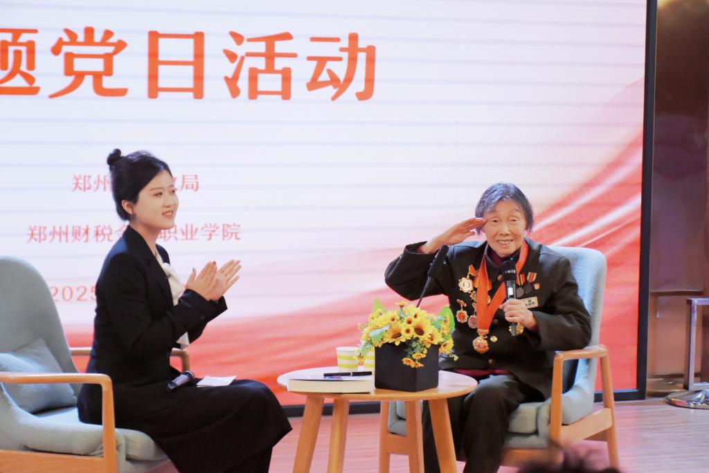在人物访谈环节,有幸邀请到了电影《英雄儿女》女主角王芳的原型--抗美援朝老战士柳岳继奶奶。已是九旬高龄的柳奶奶,深情追忆了奔赴朝鲜战场、坚守上甘岭阵地 43 天的非凡历程,分享了和平年代坚持宣讲革命故事的初心使命。她身上闪耀的非凡勇气与坚定信念,不仅让革命精神得以赓续传承,更深深震撼了现场每一位党员。为延续这份精神力量、传递榜样温度,访谈过程中柳奶奶为我校见义勇为学生代表邱丰熠同学,赠送给签名书籍,这一举措既是对青年一代挺身而出、践行正义的肯定与勉励,更让革命先辈的信仰之光与新时代青年的责任担当交相辉映,推动优良传统在薪火相传中焕发新的时代光芒。