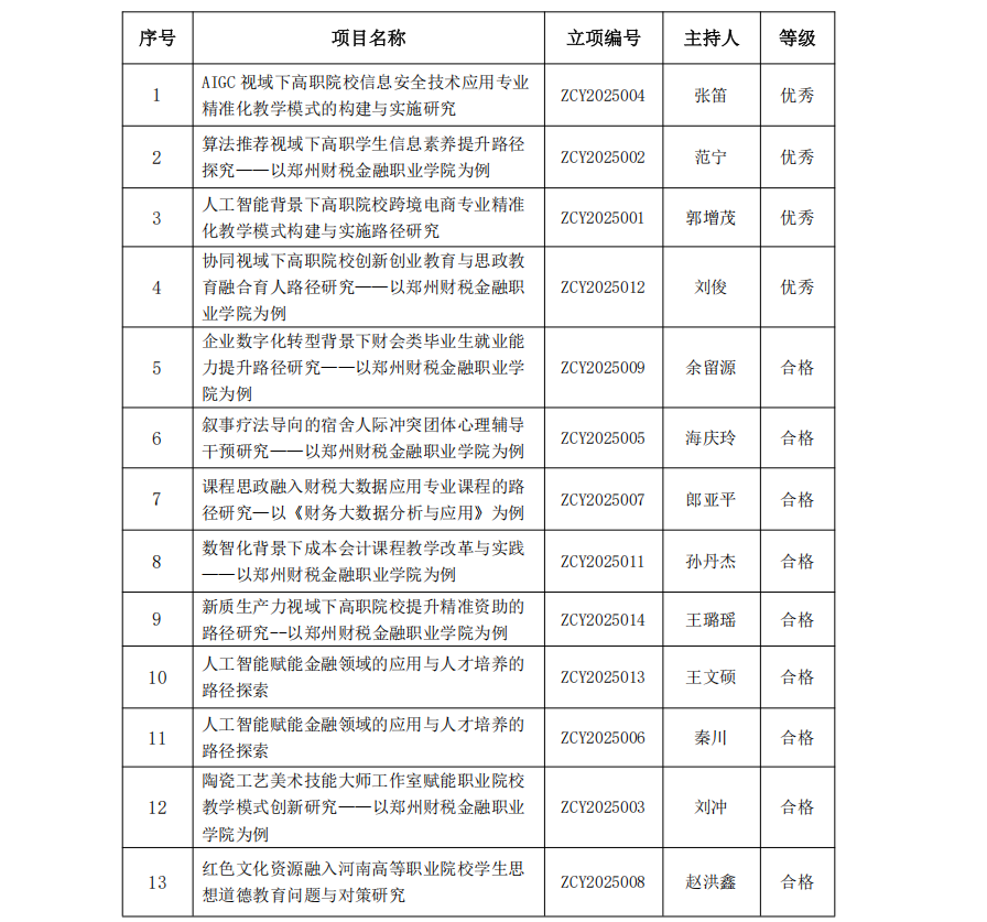 郑州财税金融职业学院2025年度校级课题结项评审结果公示