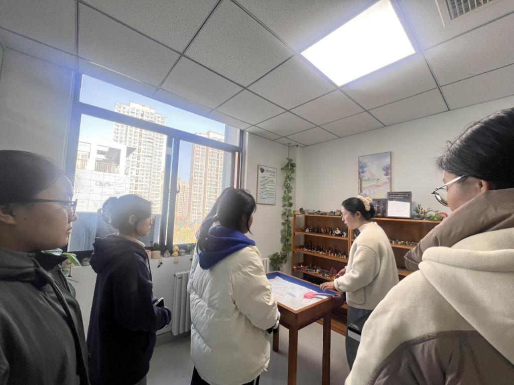 功能室主要有个体咨询室、沙盘室、情绪宣泄室和音乐放松室。参观过程中,刘老师详细讲解了咨询流程、沟通模式及保密原则,通过现场模拟简单的咨询场景,让同学们直观感受心理咨询的专业氛围,消除了“做心理咨询就是有心理疾病”的错误认知。走进沙盘游戏室,色彩丰富的沙具、细腻的沙盘吸引了同学们的目光,刘老师介绍道:“沙盘游戏是一种非语言的心理表达工具,同学们可以通过摆放沙具展现内心世界,咨询师会据此帮助大家梳理情绪、探索自我。”情绪宣泄室和音乐放松室则让同学们体验到了多样化的心理调节方式。最后,刘老师还对同学们提出的“如何预约咨询”“咨询时长是多久”“遇到紧急心理问题该怎么办”等疑问逐一解答,确保每位同学都能熟练掌握求助渠道。