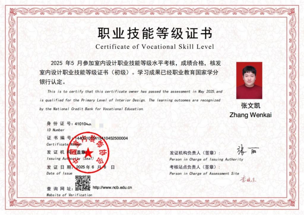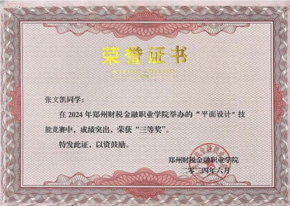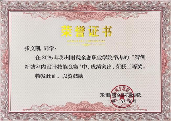 从进入郑州财税金融职业学院的那一天起,张文凯坚持每周练习设计基础课程——《设计素描》、《设计色彩》,无论在画室、实训室还是图书馆,都有他努力学习的身影。他在认真钻研专业知识、制定设计方案、绘制室内效果图之余,还前往多家设计工作室与设计师进行交流学习、探讨方案,在设计审美和理论素养方面得到了很大的提升。张文凯始终保持着高度的自律和勤奋,他刻苦钻研专业知识,积极参与各类学术竞赛和科研项目,不断提升自己的综合素质。过去两个学年,张文凯蝉联专业第一的好成绩,并在各类专业比赛中屡获佳绩。