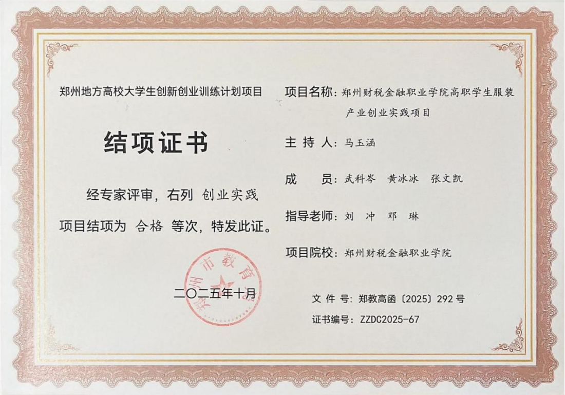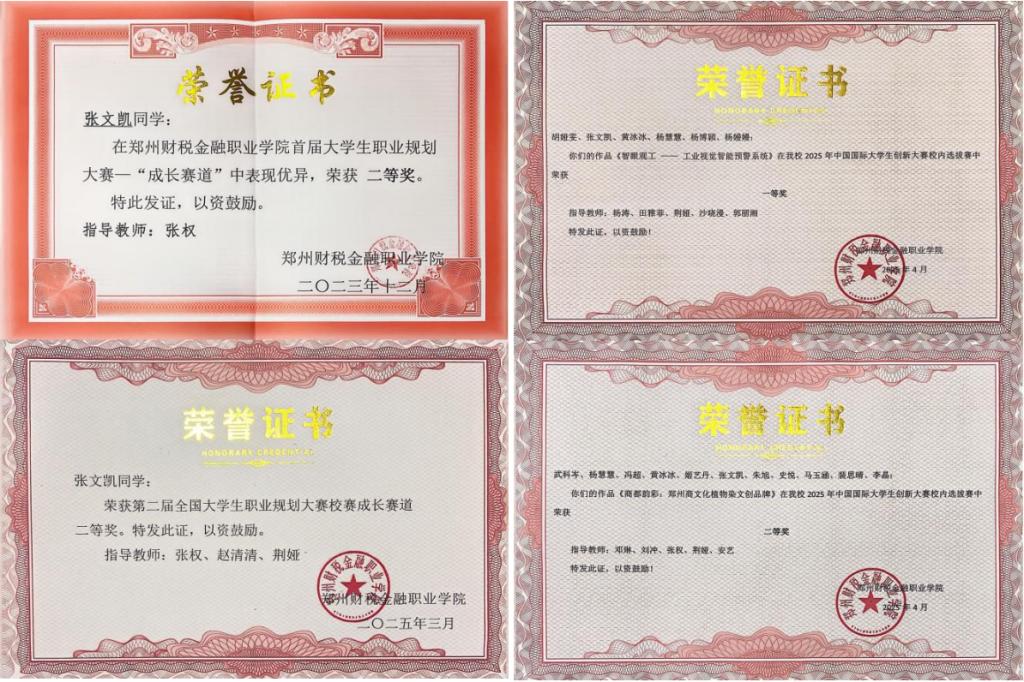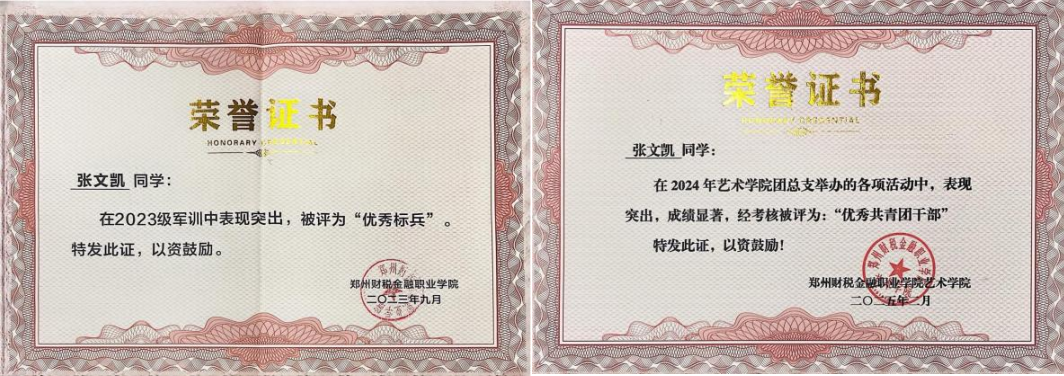 张文凯,男,汉族,2005年5月生,中共预备党员,现为郑州财税金融职业学院艺术学院2023级室内艺术设计1班学生。在校期间,个人成绩稳居专业前10%,综合考评位列班级第一。先后担任班长、学院团总支副书记、年级长、党支部学生干事、“冲锋号”志愿者服务队管理负责人等主要学生干部。截至目前,已斩获国家级奖项1项、省部级奖项3项、市厅级奖项1项、院级及以上荣誉60余项,荣获“河南省优秀学生干部”称号,参与郑州地方高校大学生创新创业训练计划项目,带领所在班级荣获“河南省先进班集体”荣誉称号,并在职业规划大赛、创新创业大赛等主流赛项中均取得优异成绩。