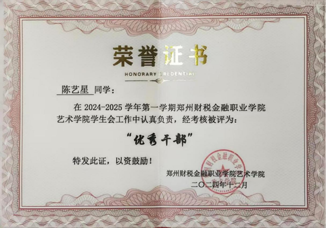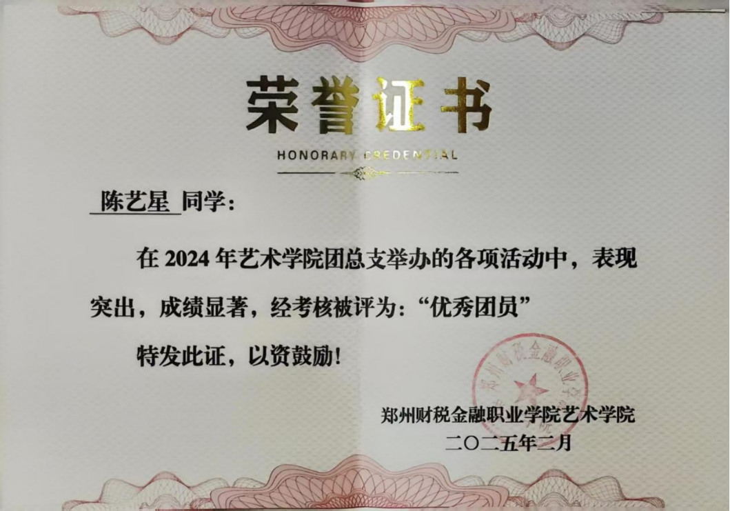 陈艺星,2004年5月生,共青团员,已被确定为入党积极分子,曾任班级学习委员、艺术学院学生会办公室部长。她始终追求全面发展,专业成绩稳居班级前10%,操行分位列第一,累计斩获省级奖项5项、校级及以上荣誉20余项,以卓越综合素质诠释新时代青年担当。