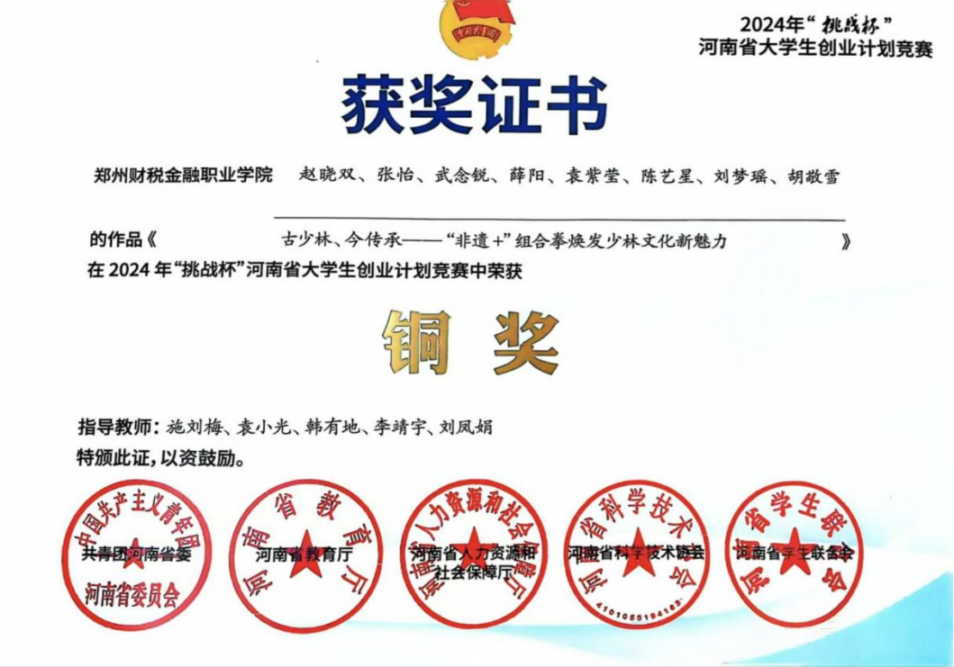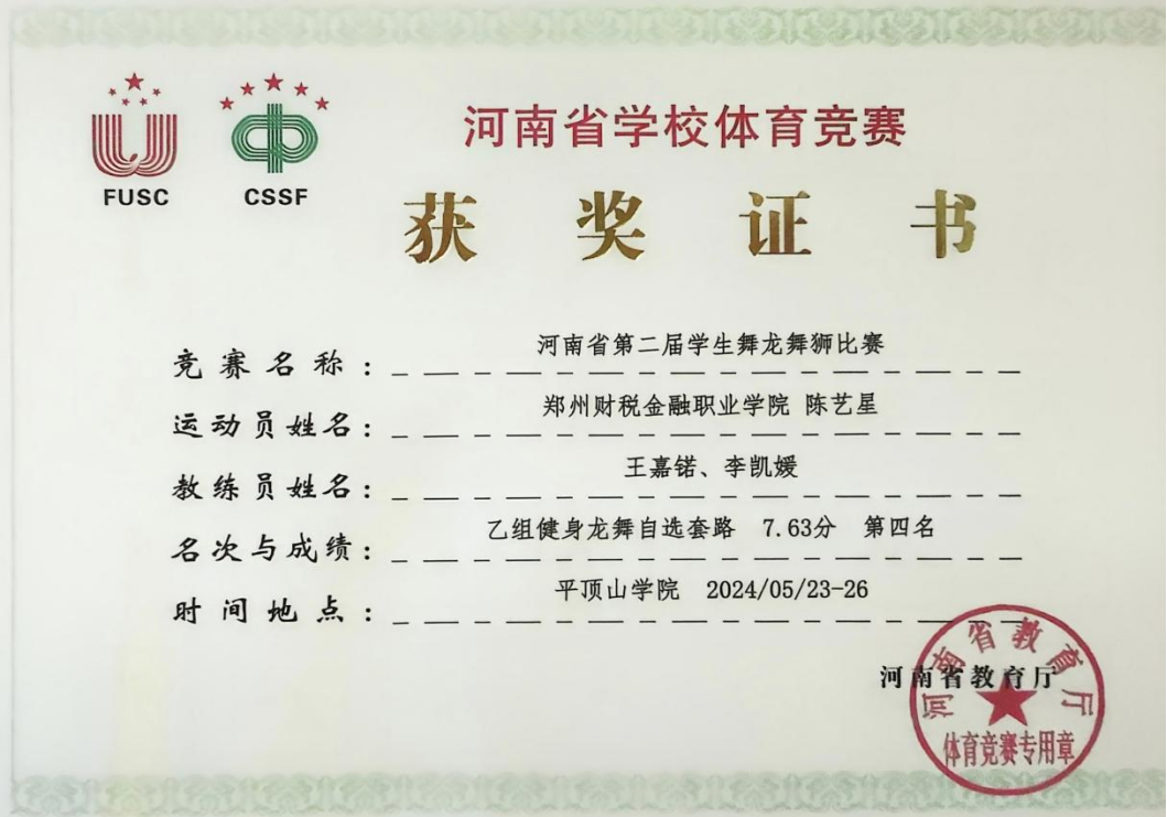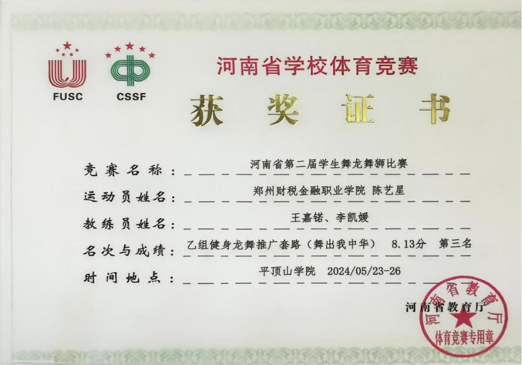 陈艺星秉持“以赛促学”理念,在各类竞赛中屡创佳绩。备赛校职业规划大赛时,她通过录音复盘、反复背诵巩固,最终以90.28分脱颖而出,更凭借此项目斩获河南省2024年挑战杯铜奖,带领团队荣获2025年创业大赛红旅赛道三等奖。在2024年河南省舞龙舞狮比赛前,她因训练扭伤脚踝仍坚持参赛,与队员默契配合斩获乙组推广套路第三名、自选套路第四名,彰显坚韧毅力。
