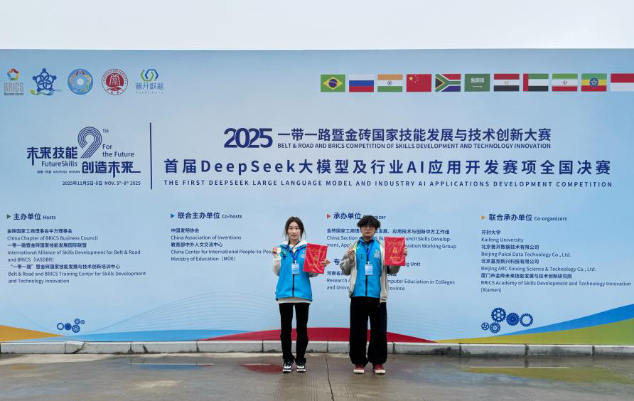 【通讯员:王章全】11月6日-8日,2025年“一带一路”暨金砖国家技能发展与技术创新大赛首届DeepSeek大模型及行业AI应用开发赛项全国总决赛在开封大学隆重举行。经过激烈角逐,我院代表队表现优异,与来自全国的150多支参赛队伍近300名参赛选手同台竞技,由2024级人工智能技术应用专业学生贾雯喜和姚泰圆组成的团队荣获二等奖,学校获优秀组织奖。