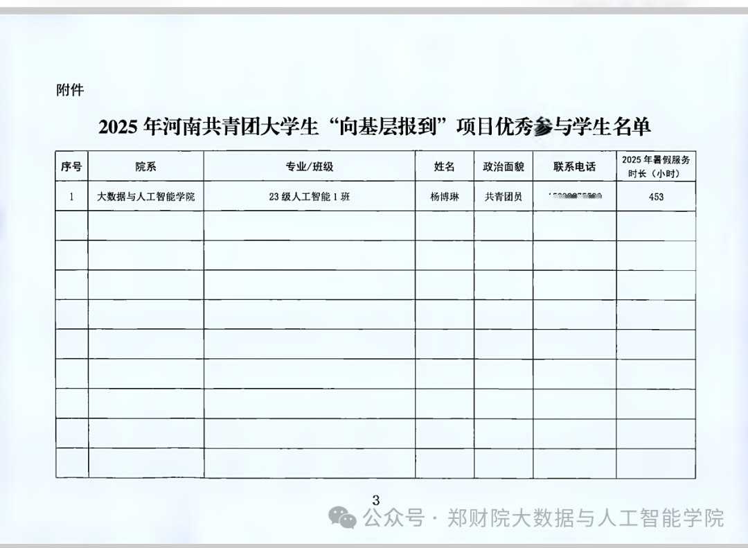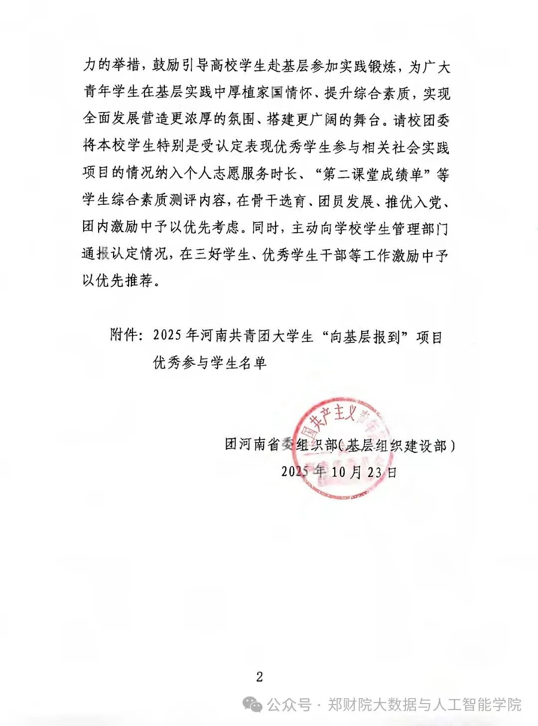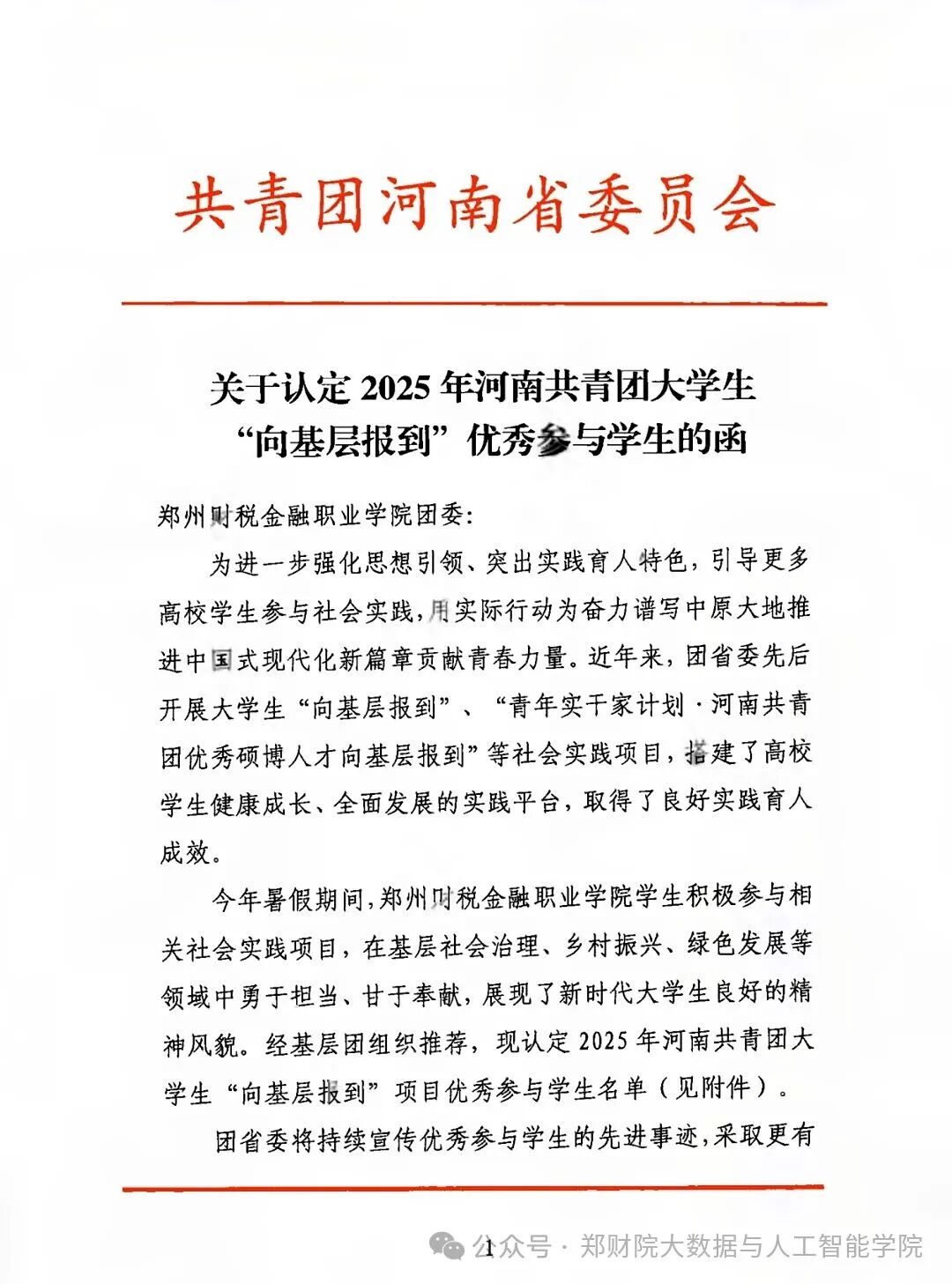 【通讯员:李雅迪】近日,从共青团河南省委员会传来喜讯,在《关于认定2025年河南共青团大学生“向基层报到”优秀参与学生的函》中,我院23级人工智能1班杨博琳同学被授予“优秀参与学生”称号。