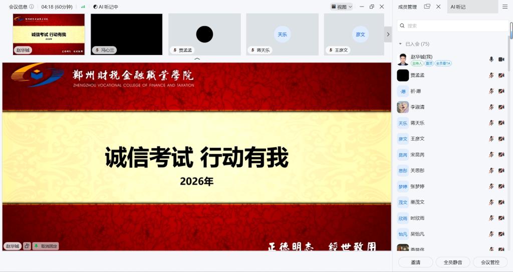 【通讯员:王通达】为进一步筑牢专升本考生的诚信应考思想根基,严肃考风考纪,保障考试公平公正,大数据与人工智能学院于2026年3月17日组织23级各班召开诚信考试主题班会。本次班会旨在筑牢考生诚信应考思想根基,严肃考风考纪,引导学生树立正确考试观,以诚信姿态迎接专升本考试。