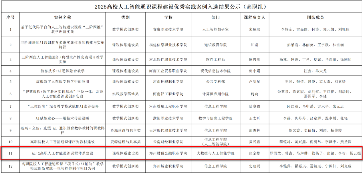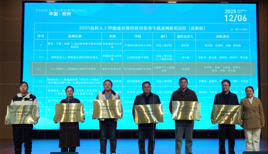 【通讯员:罗雪莹】近日,由全国人工智能通识教育产教融合共同体与河南省人工智能学会联合主办的“2025高校人工智能通识课程建设优秀实践案例”评选结果揭晓,我院大数据与人工智能学院张金娜主持申报的《AI+X高职人工智能通识课程体系建设》案例成功入选,荣获“课程体系建设类”优秀实践案例。