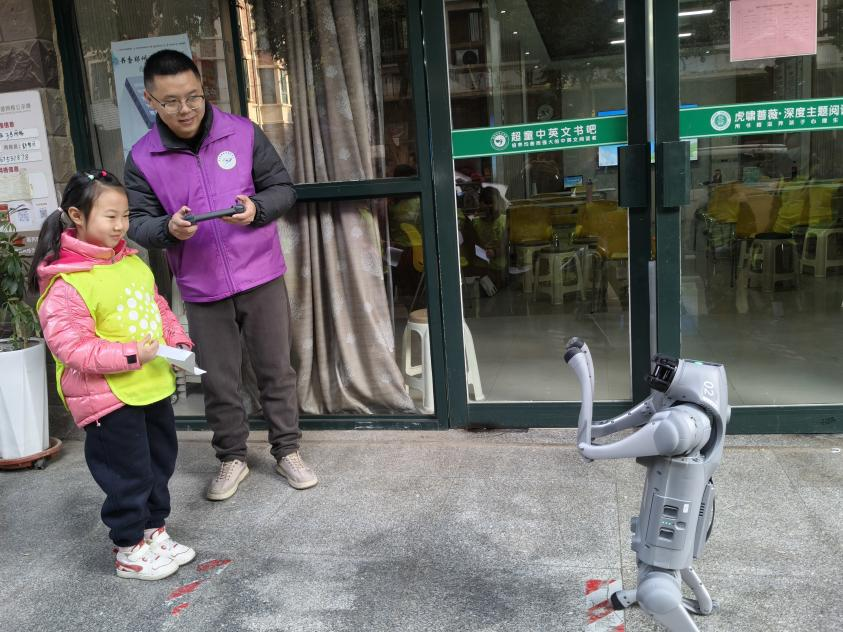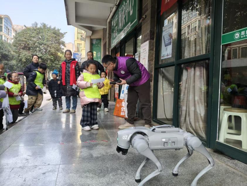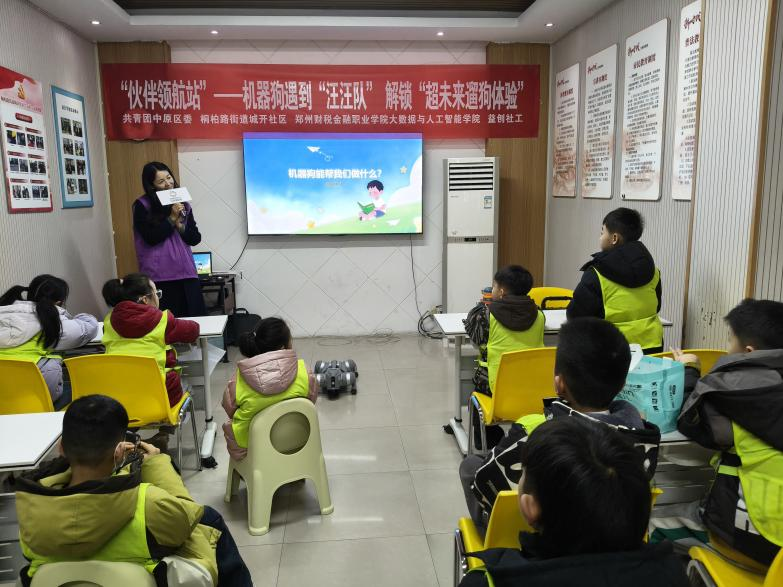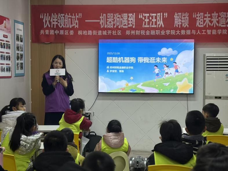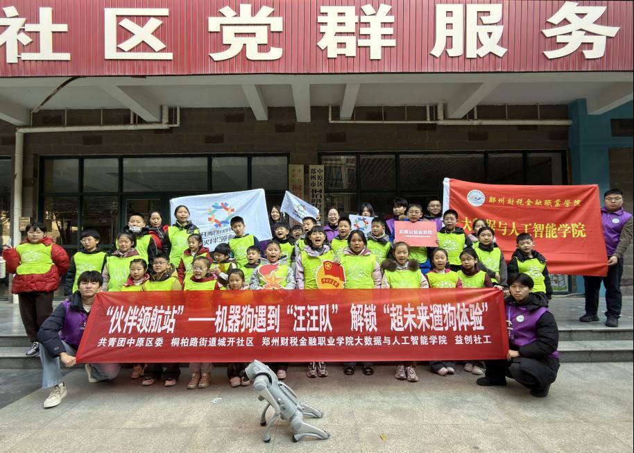 【通讯员:罗雪莹】为激发青少年对智能科技的兴趣,普及机器狗科学知识,2025年12月27日上午,我校大数据与人工智能学院师生志愿者携手共青团中原区委、城开社区党委、益创社工,共同举办“伙伴领航站”——“机器狗遇到‘汪汪队’,解锁‘超未来遛狗体验’”主题科普活动。近50名辖区青少年与机器狗“笨笨”展开亲密互动,在科技与萌趣的碰撞中点燃了创新热情。