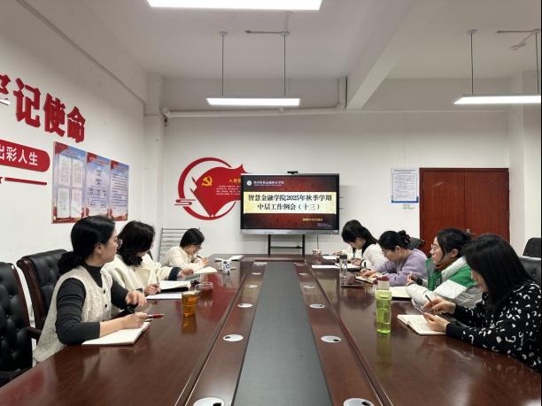 【通讯员:张航】12月22日下午,智慧金融学院在明德楼214会议室召开2025年秋季学期第十三次中层干部例会。会议由综合办公室主任郭会芳主持,院长吕永霞、党总支书记赵碧漪、副院长赵歌及全体中层干部参会。