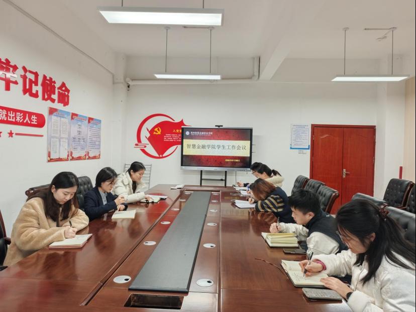 【通讯员:杨柯磊】2026年1月8日下午,智慧金融学院在明德楼214会议室召开学生工作会议。学院党总支书记赵碧漪、学团办主任张航以及24、25级专兼职辅导员参加了会议。