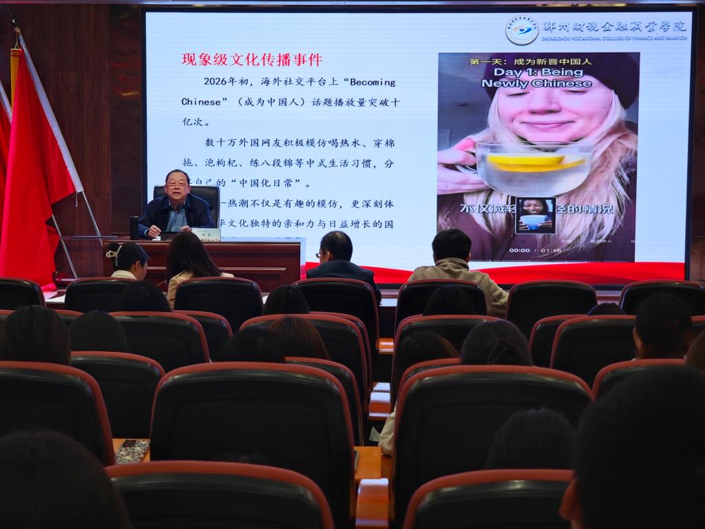 课堂上,程慎从近期海外社交媒体上“Becoming Chinese”热潮切入,指出这一现象不仅展现了中华文化独特的亲和力,更彰显了其日益增强的国际影响力。课程围绕“中华优秀传统文化的内涵”“中华优秀传统文化的当代价值”“大学生传承与创新的实践路径”三个方面展开,系统梳理了中华优秀传统文化的核心要义,指出其为社会主义核心价值观提供了深厚的思想沃土和价值支撑。他结合《黑神话:悟空》《燕云十六声》等文化出海的成功案例,生动展示了中华优秀传统文化在新时代焕发出的蓬勃生机。在谈到青年学生的责任与使命时,程慎结合郑州商都历史文化区建设、非遗数字化传播等实例,鼓励同学们要系统学习经典、践行传统美德、传承非遗技艺、创新表达方式,做中华优秀传统文化的守护者、传承者和创新者。