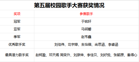 经过激烈角逐,最终,共评选出冠、亚、季军各一名,优秀选手5名,最具潜力歌手7名。大赛在热烈的掌声中圆满落下帷幕。