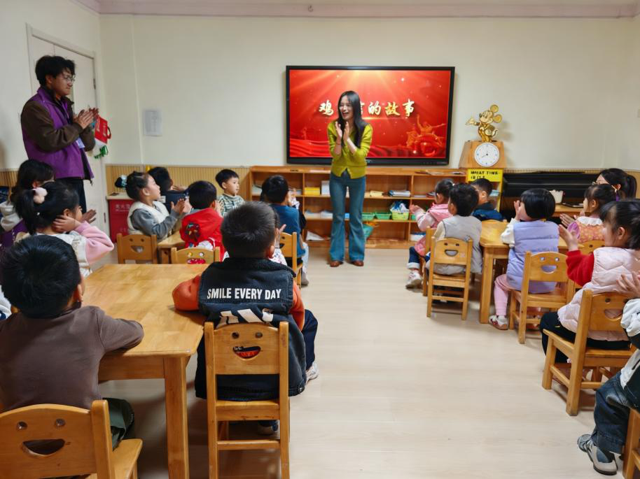 带队老师韩委轩走进永恒尚东幼儿园,以红色经典《鸡毛信》为载体,为孩子们讲述小英雄海娃智送情报的故事。生动的情节紧紧吸引着孩子们的注意力,当听到海娃成功完成任务时,现场响起一片稚嫩的赞叹声。这场沉浸式的红色教育,不仅是我校“红色财税”育人品牌的实践延伸,更是让红色基因在孩童心中扎根、传承的生动实践。