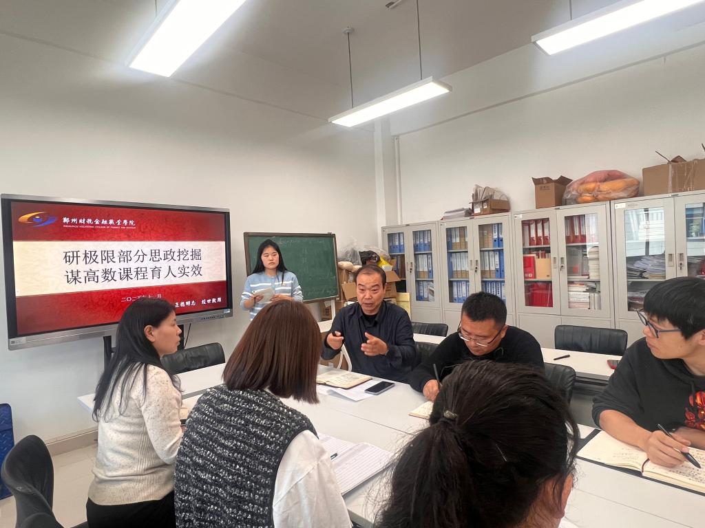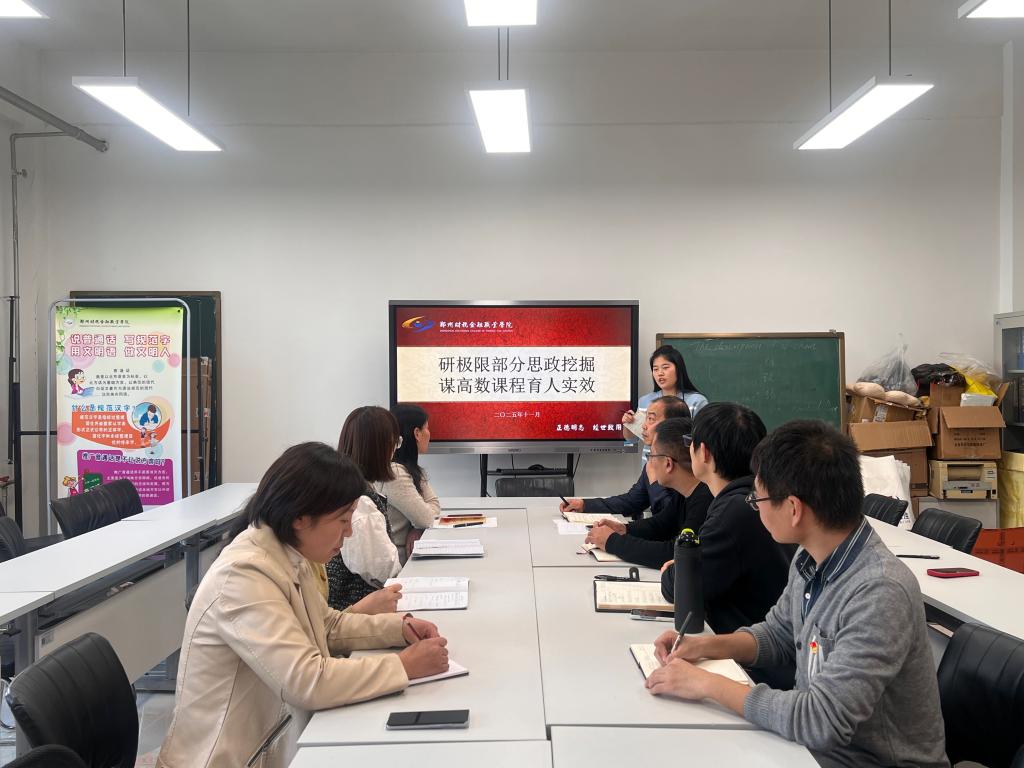 【通讯员:张志恒】为深入贯彻落实立德树人根本任务,推动职业教育课程思政与专业教学深度融合,11月4日下午,基础部开展以“研极限部分思政挖掘,谋高数课程育人实效”为主题的教学研讨会,围绕高等数学“极限”章节的思政元素挖掘、教学设计创新及育人实效提升展开深入研讨。