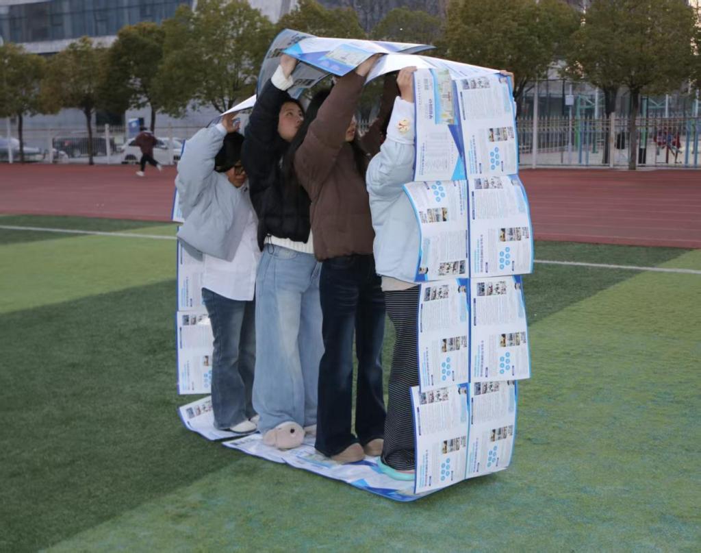 活动现场,四大竞技项目环环相扣,考验着团队的默契与协作智慧。在“同心击球”环节,队员们需通过牵引绳控拍击球,稍有不慎便前功尽弃;“合力建塔”则要求全员协作搭建积木塔,每一次调整都需精准配合;随后的“五人六足”与“履带战车”将活动推向高潮——前者需五人步伐一致跨越障碍,后者则需全员钻入“履带”中同步前行。面对重重挑战,各小组迅速打破部门壁垒,通过试错优化分工,在欢呼与呐喊中完成了一次次挑战性任务。一名参与学生感慨:“从手忙脚乱到默契配合,我们学会了在分歧中寻找共识,在失败中总结经验。”