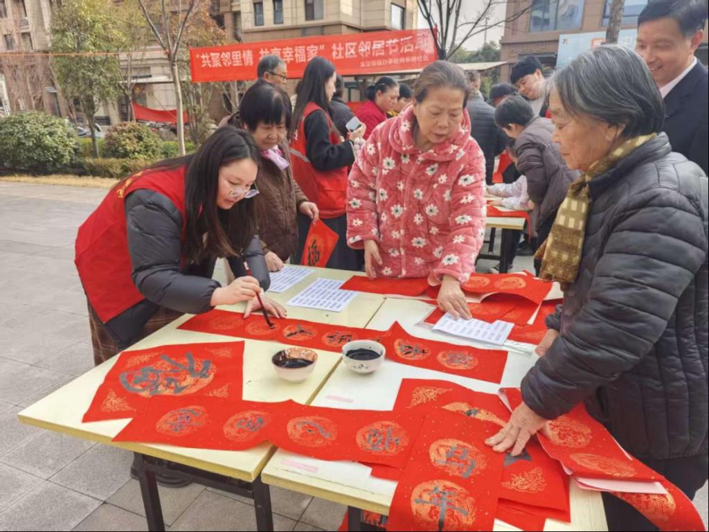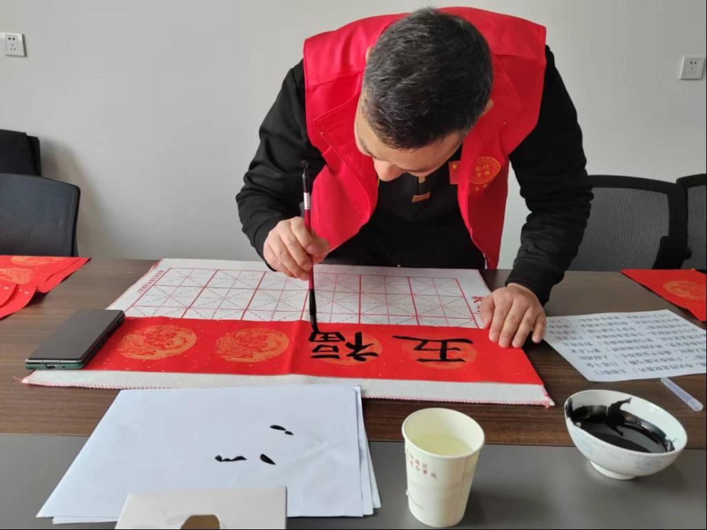 活动现场翰墨飘香,暖意融融。党员教师与社区书法爱好者、居民齐聚一堂,挥毫泼墨,书写春联和“福”字。一副副充满吉祥寓意的春联,一个个饱含温情的“福”字,不仅传递着对新年的美好憧憬,也承载着对社区群众的真挚祝福。党员教师们主动与居民交流,分享传统年俗文化,了解社区生活,倾听群众心声,现场气氛热烈而融洽。