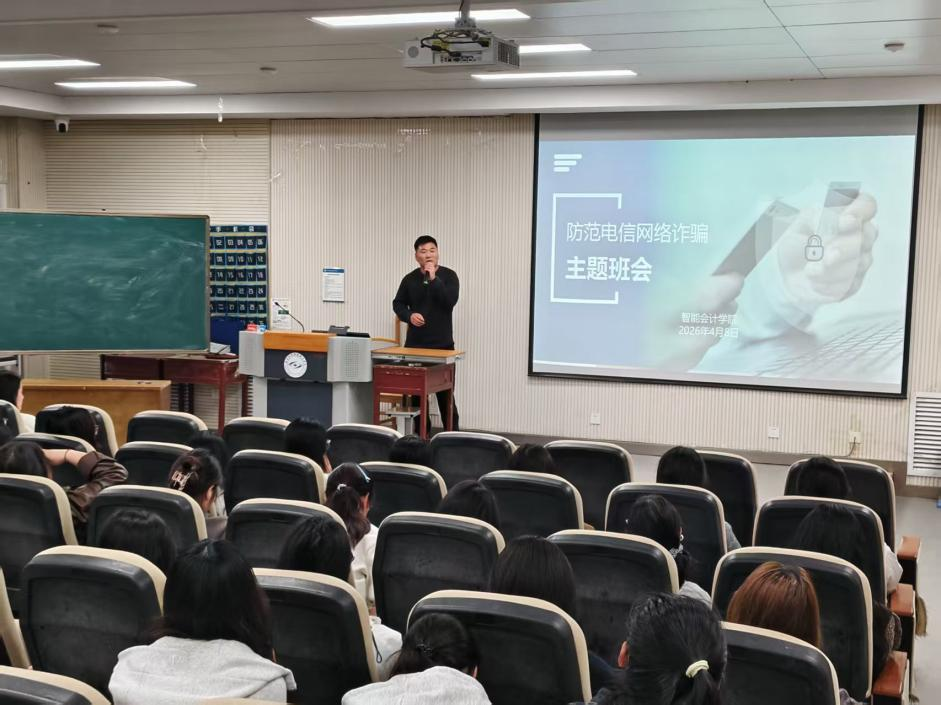 【通讯员:甄婉璐】为筑牢学生反诈安全防线,提升校园反诈防范能力,2026年4月8日,智能会计学院组织开展防范电信网络诈骗主题班会。学院党总支副书记刘文超及25级财务管理专业全体学生共同参会,班会由25级辅导员甄婉璐主持。