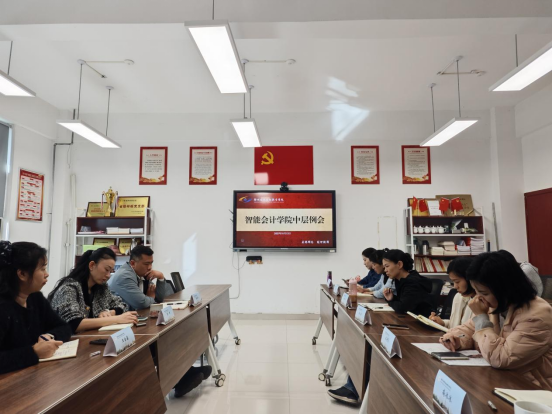【通讯员:黄晴】10月13日下午,智能会计学院在明德楼205会议室召开秋季学期第六次中层例会,智能会计学院院长董昕、党总支书记薛现平、副院长王金鑫及全体中层参加了此次会议。会议由党政办公室主任刘俊主持。