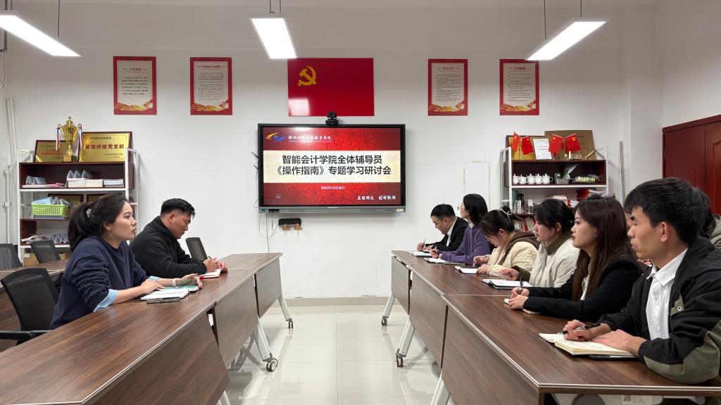 【通讯员:李浩泽】为全面提升全体辅导员的学生管理能力,2025年10月20日下午,智能会计学院在明德楼205会议室召开全体辅导员《河南省本科高校学生管理工作分时、分类操作指南》专题学习研讨会,党总支副书记刘文超及全体专兼职辅导员参加会议,会议由学团办主任余留源主持。