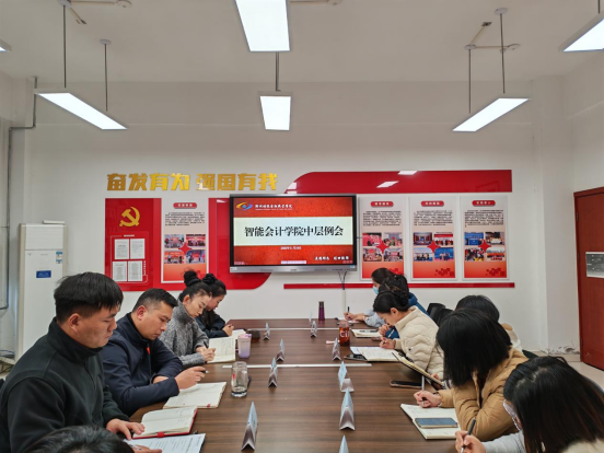 【通讯员:魏佳伲】11月24日下午,智能会计学院在明德楼209会议室召开秋季学期第十二周中层例会,智能会计学院院长董昕、党总支书记薛现平、副院长王金鑫、党总支副书记刘文超及全体中层参加了此次会议。会议由党政办公室主任刘俊主持。