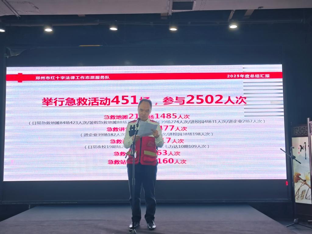 【通讯员:张轩橙】岁末回望,初心如磐。2026年2月1日,我院青衿急救社应邀参加了郑州市红十字法律工作志愿服务队在高新区举行的2025年度总结交流会,会议由青衿急救社社长张贺主持,来自郑州市红十字会、郑州市志愿服务联合会、二七区委宣传部、高新区公共事业部、二七区红十字会、高新区红十字会等单位的有关领导及60余名志愿者代表出席。