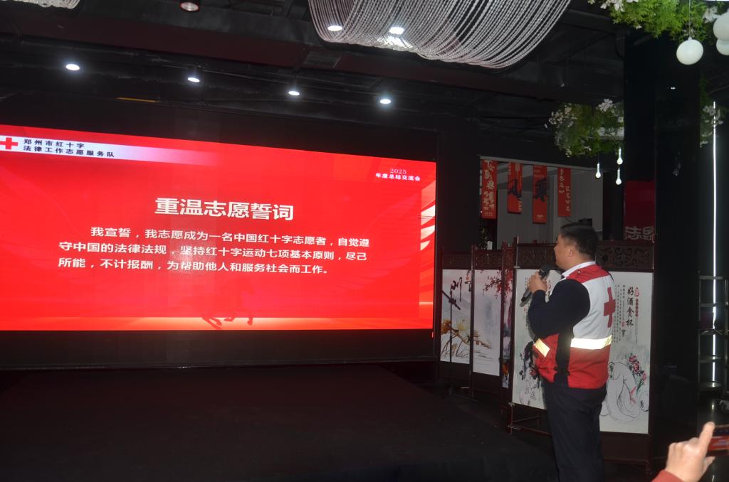 随后,郑州市红十字法律工作志愿服务队队长冯海河做了《2025年度总结汇报》。在副队长李中洲的领誓下,志愿者们重温了中国红十字志愿者誓词。
