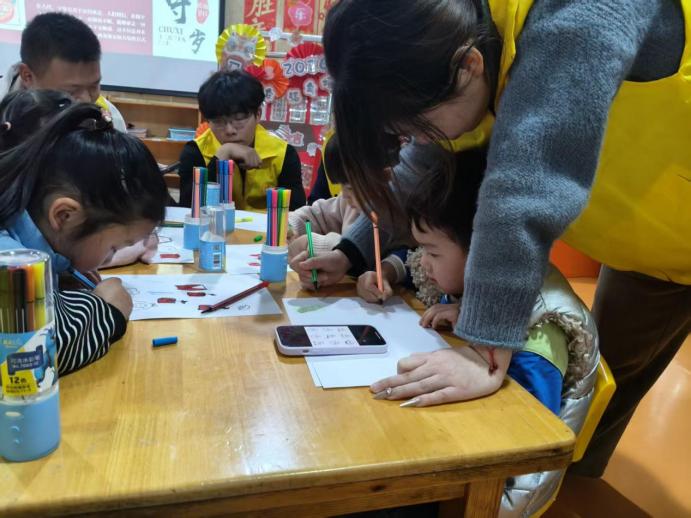 待小朋友们充分了解节日习俗后,志愿者们随即切换为贴心的“绘画导师”,带领大家开启创意绘画之旅。大家围绕春节习俗相关主题尽情创作,憨态可掬的生肖形象、红彤彤的吉祥灯笼、饱含祝福的春联图案。一个个鲜活的文化意象在孩子们的笔下逐渐成型。志愿者们耐心指导小朋友调配色彩、勾勒线条,鼓励大家大胆发挥想象,将对传统文化的理解融入画作之中,让孩子们在沉浸式创作里深化文化感知,尽享艺术乐趣。