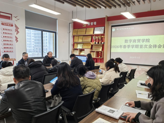 【通讯员:王婉婷】新学期伊始,为进一步贯彻落实各项工作目标任务,确保新学期教学工作顺利进行,3月4日下午数字商贸学院在明德楼308会议室召开2026年春季学期首次全体教职工会议。