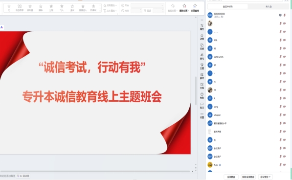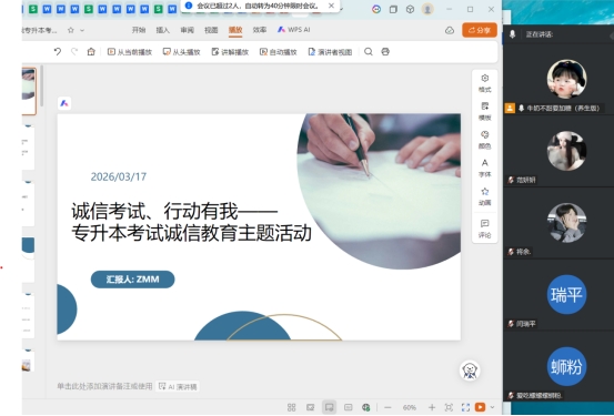 【通讯员:刘慧蒙】2026年专升本考试在即,为切实做好考前教育与服务保障工作,进一步端正考风、严肃考纪,引导广大考生树立诚信考试理念,数字商贸学院于3月17日晚组织23级全体专升本考生召开“文明考风,诚信考试”线上主题班会。本次班会由23级各班专兼职辅导员主持,全体专升本考生参会。