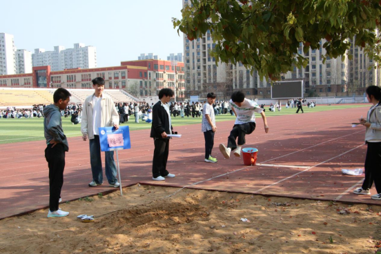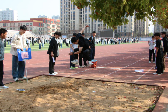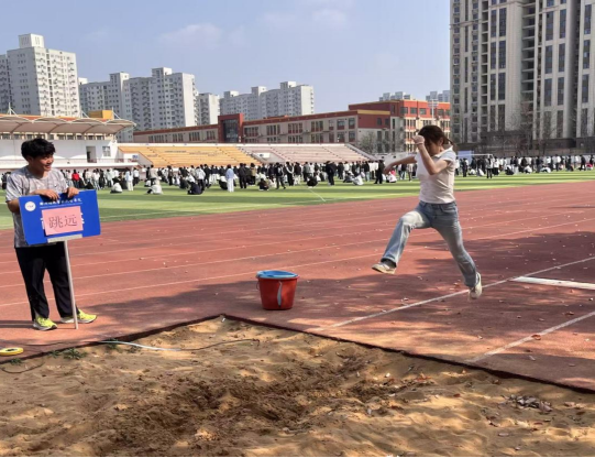 跳远赛场精彩纷呈,随着指令发出,参赛选手目光坚定、沉着应战,快速助跑、奋力踏板,身体腾空而起,在空中划出一道道流畅优美的弧线后稳稳落地。每一次奋力跳跃,都是力量与爆发力的精彩展现;每一次突破自我,都赢得现场同学的阵阵掌声与喝彩。