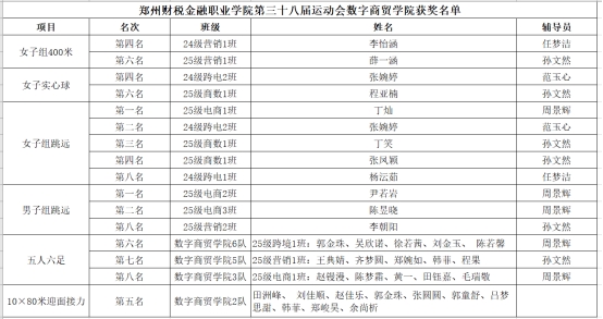 【通讯员:潘嘉雯】春风送暖,万象更新。4月16日至4月17日,郑州财税金融职业学院第三十八届运动会在学校体育场隆重举行。数字商贸学院师生满怀热忱、积极参与,共赴这场凝聚青春力量、展现体育风采的盛会。本届运动会既是全校师生体育竞技水平的集中检阅,更是青年学子精神风貌的全面展示,学院运动健儿们在赛场上奋勇拼搏、超越自我,以昂扬斗志和扎实实力,书写了属于数商学子的荣耀篇章。