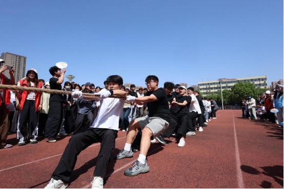 团体项目的激烈角逐,将整场运动会氛围推向最高潮,也尽显学院学子凝心聚力、团结协作的强大向心力。拔河比赛中,学院代表队队员们紧握麻绳、双脚扎根地面,身体全力后倾,大家心往一处想、劲往一处使,伴随着整齐的号子声全力以赴,每一次拉扯都凝聚着集体的力量,场面紧张又热烈。