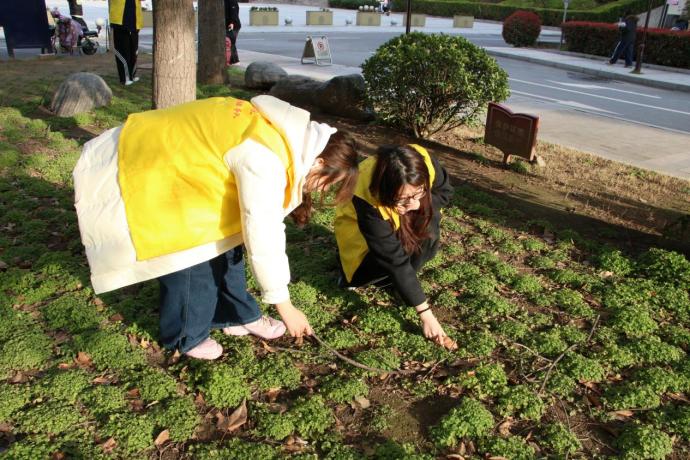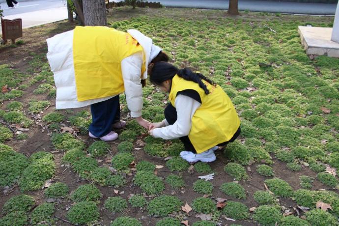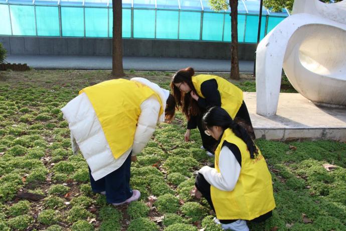 随后,志愿者们前往绿草如茵的校园草坪区域。草坪是同学们课余休憩、阅读交流的重要场所,散落的垃圾却影响着整体环境美观。大家俯身深入草丛,细致搜寻藏匿其中的果核、纸巾、瓶盖、食品包装袋等不易察觉的杂物。行走间,志愿者们格外小心,避免踩踏嫩草新芽,每一次弯腰捡拾,都是对校园环境的用心呵护,也是对自然生态的自觉尊重。有的志愿者蹲在草坪边缘,伸手清理灌木丛底部积存的塑料袋与废纸;有的两两配合,一人捡拾、一人撑袋,分工明确、默契高效。