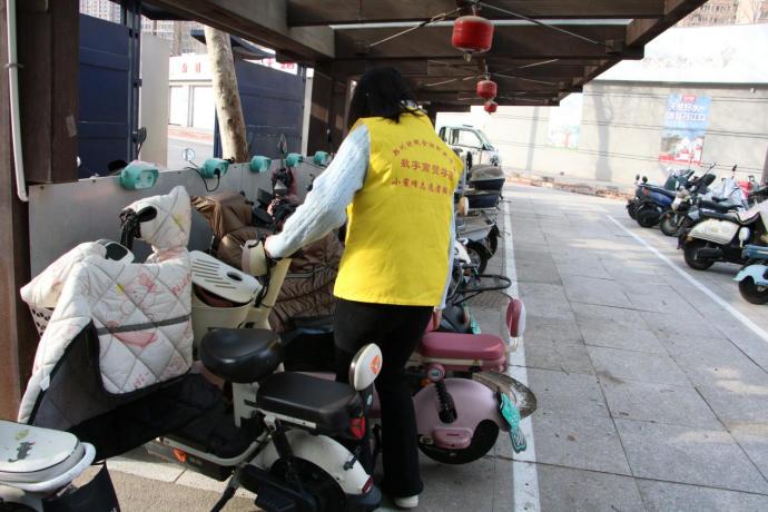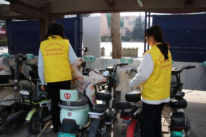 最后,志愿者们来到校园自行车棚开展整理工作。随着校内自行车、电动车数量增多,车辆乱停乱放问题较为突出,不仅影响校园美观,也给师生通行带来不便。面对这一难点,志愿者们主动担当、迎难而上。大家分工协作,将倒地车辆逐一扶起,把车辆有序挪移至指定停放区域,并按照车头朝向统一的标准规范摆放。尽管汗水浸湿衣衫,大家依旧干劲十足,没有一人叫苦喊累。经过近一小时的认真整理,原本拥挤杂乱的车棚变得井然有序,车辆排列整齐划一,过往同学纷纷投来赞许的目光。