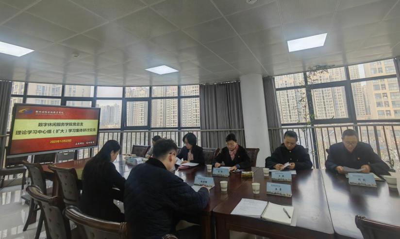【通讯员:张萨】2025年12月23日下午14:30,数字休闲服务学院党总支理论学习中心组(扩大)学习集体研讨交流在明德楼四楼北会议区举行。会议由数字休闲服务学院党总支书记刘钦主持,数字休闲服务学院院长石玫珑和学院中层干部参会,党委副书记董娣和宣传部部长王琪进行了巡听旁听。