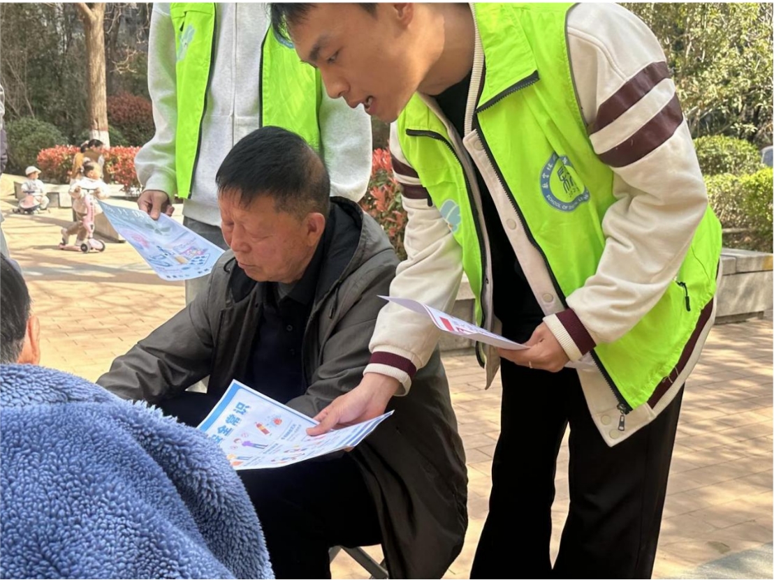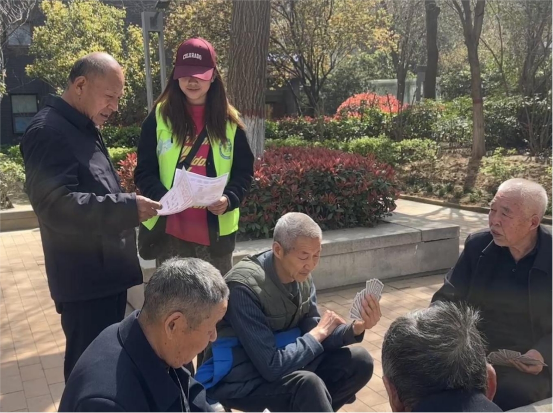 在社区工作人员的引导下,志愿者们迅速分工协作,深入社区广场、居民休闲区等场所,主动向老年居民发放安全宣传手册,围绕消防安全、防电信诈骗、居家用电用气安全、禁止电动车上楼等重点内容,用通俗易懂的语言耐心讲解安全知识与防范技巧,细致解答居民疑问,将安全理念传递到每一位居民心中。