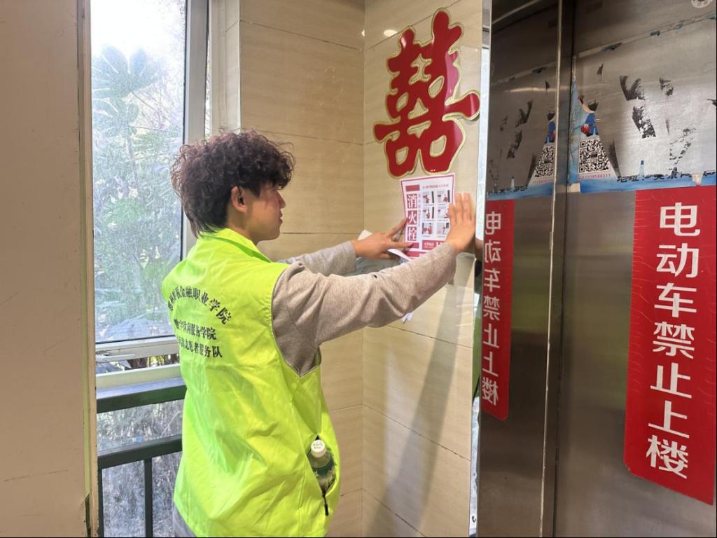 随后,志愿者们走进居民楼,在电梯间、公告栏等醒目位置张贴消防安全警示标识、安全须知海报,全面排查安全宣传盲区,确保安全知识覆盖社区各个角落。过程中,志愿者们态度认真、行动高效,以饱满的热情完成各项任务,展现出当代大学生良好的精神风貌与责任担当,获得社区居民与工作人员的一致好评。