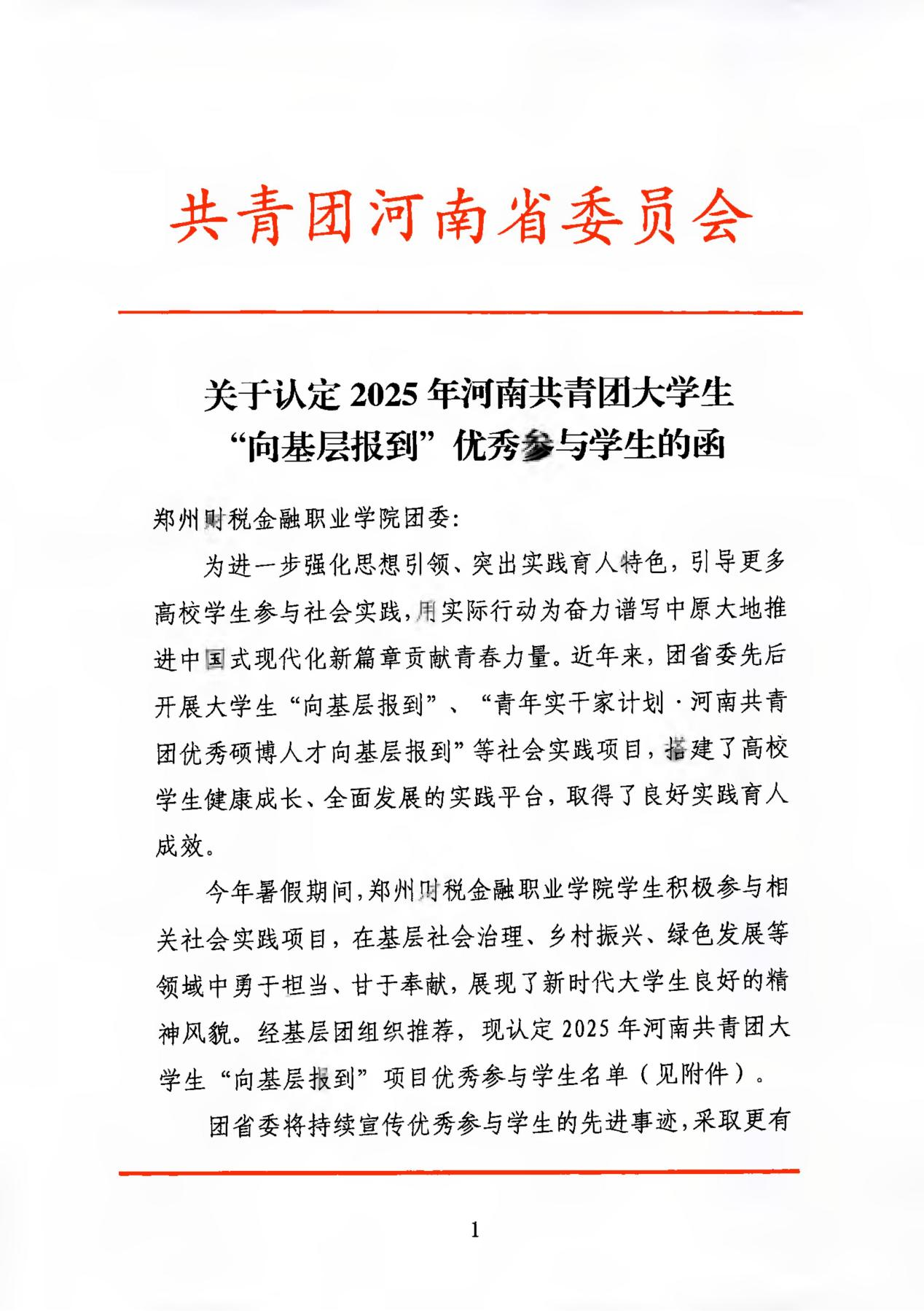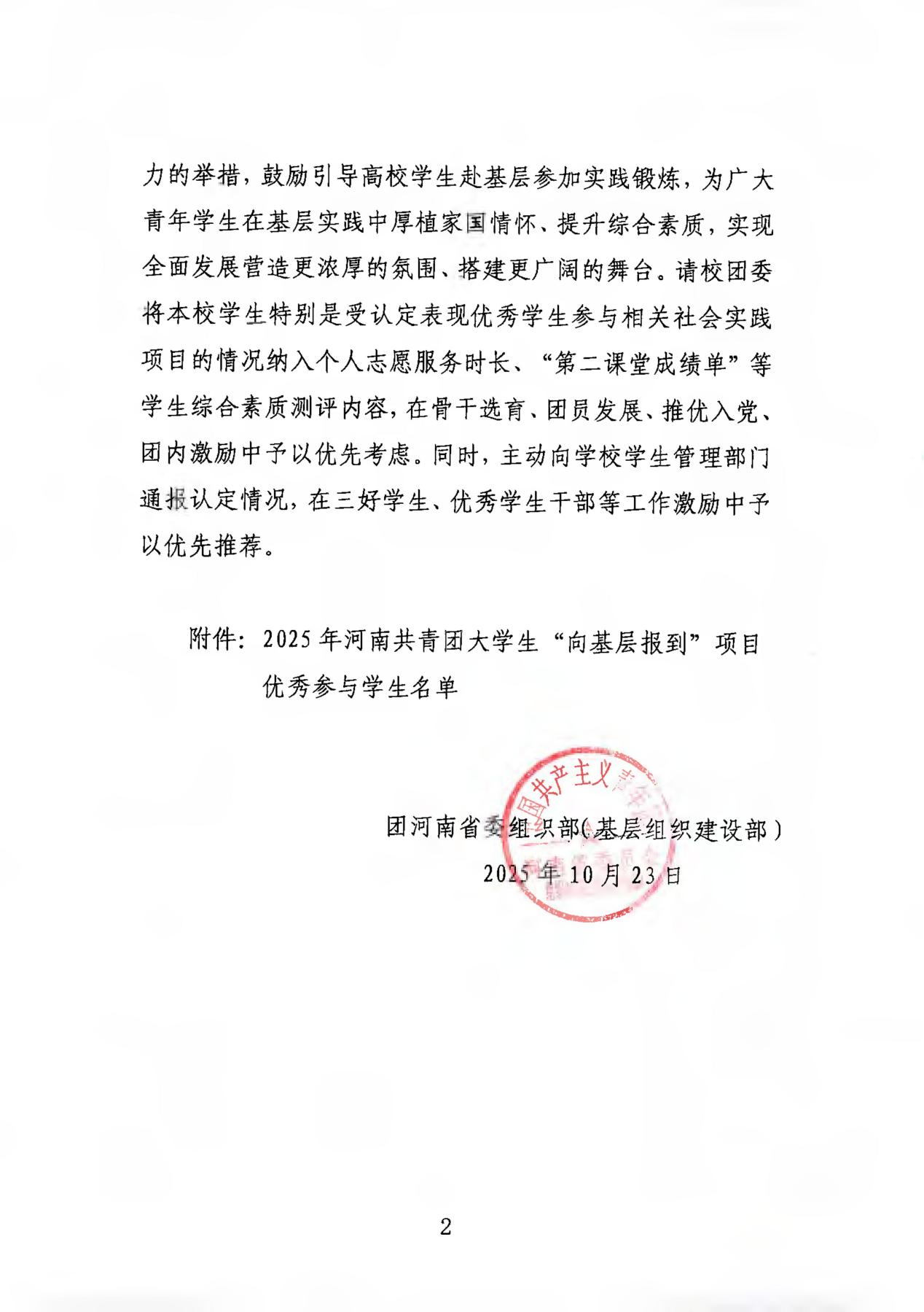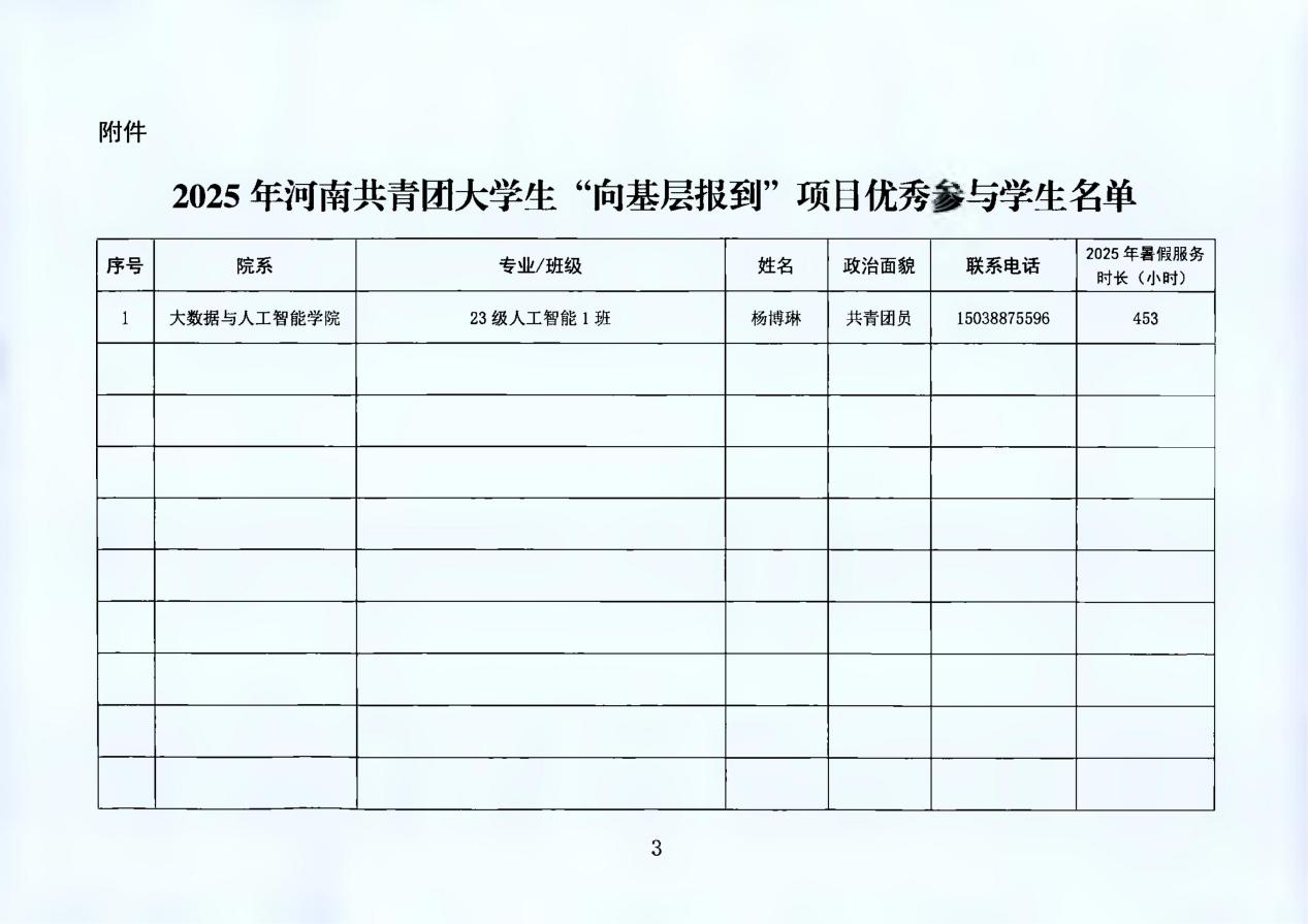 【撰稿人:赵腾】近日,共青团河南省委员会下发认定函,我校2023级大数据与人工智能学院人工智能1班学生杨博琳凭借暑假期间453小时的基层志愿服务时长、突出的实践表现,被认定为2025年河南共青团大学生“向基层报到”优秀参与学生,获团省委专项表扬。