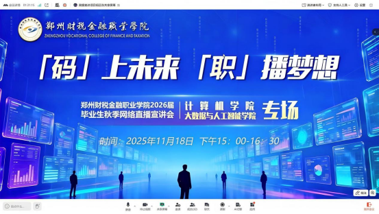 【通讯员:赵华铖】为拓宽毕业生就业渠道,搭建校企精准对接桥梁,11月18日15:00-16:30,郑州财税金融职业学院计算机学院联合大数据与人工智能学院,依托腾讯会议平台成功举办“码上未来 职播梦想”2026届毕业生秋季线上专场招聘会。活动邀请河南中科智信信息科技有限公司、京隆科技(苏州)有限公司、华天科技(南京)有限公司、杭州陆汇智能科技有限公司参会,为毕业生送上丰富就业岗位。