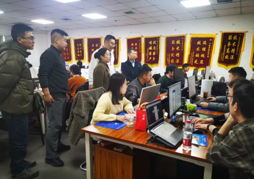 中犇科技集团联合创始人、副总裁李世伟,商务总监王磊,教育事业部总监宋军伟等带领调研团队实地参观了AI智能编程、人工智能技术BI可视化、SaaS、PaaS及物联网等应用领域设计部、产品部、技术部、测试部。参观过程中,王磊详细介绍了公司与多所高校共同打造现场工程师、生产性实训基地等典型项目,开展校企合作、产教融合的情况。